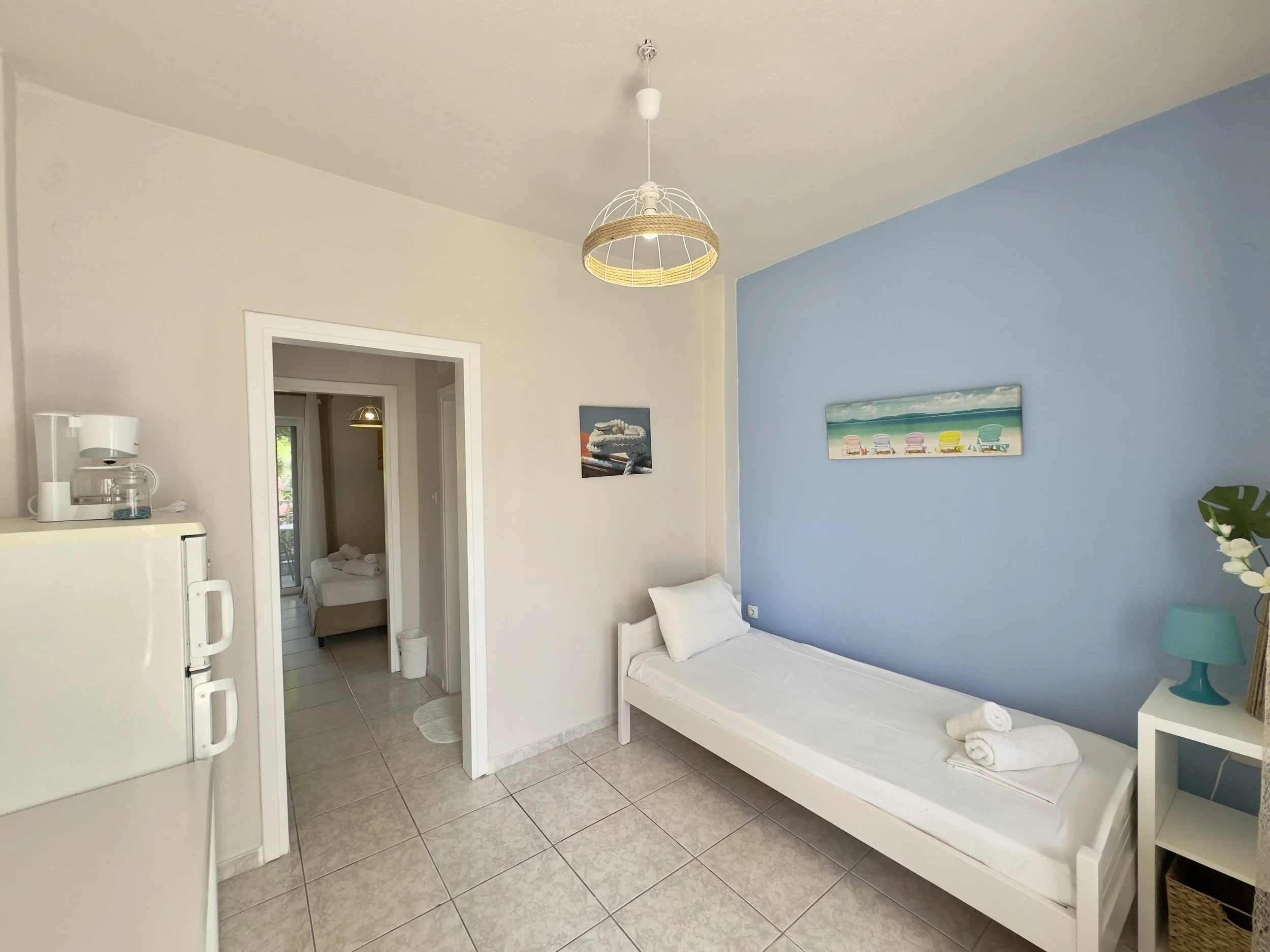 The Bright Apartment is on the first floor and consists of two separated rooms a small hall and a bathroom. In the first room, there is a sofa bed that becomes two separated single beds, a table with chairs and a TV. As you get there, there is a fully-equipped kitchen with fridge, oven and kitchen utensils for those who prefer self-catering. In the second room, there's a big double comfortable bed. The apartment has two balconies where you can enjoy and relax viewing the sea, the amazing sunset and of course the green garden. (up to 3 people)